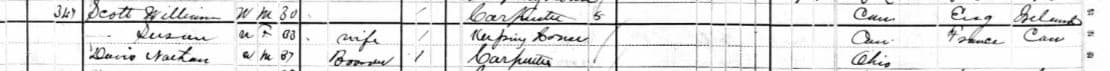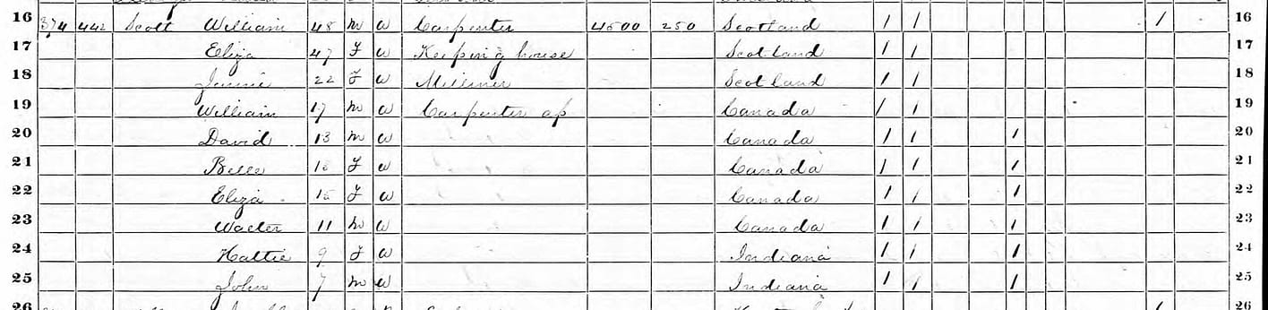 William Scott Sr., Jr., Eliza, and family, 415 S. Tennessee St., Indianapolis, Indiana. 1870 U.S. Census. In the 1870 U.S. Census, William Scott Sr. had 8 children, not 7. In 1859, William Sr. and his family immigrated to the United States and moved to Indianapolis, Indiana. Promptly after arriving, William Sr. started carpentry work to support his large family. Notably, the Scott family owned their house in 1870, so William Sr. was quite successful as a Carpenter/Builder, obviously profiting handsomely from the rapid growth of Indianapolis at that time.