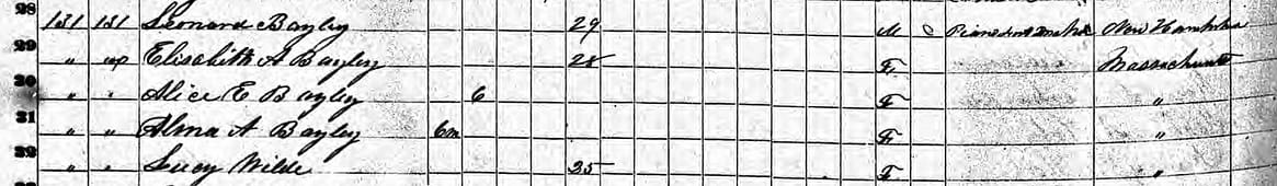 Leonard Bailey, 29, “Pianoforte Maker,” and wife Elizabeth A. Wildes, 26 with their children, i30 Salem St. Winchester, in the 1855 Massachusetts State Census.