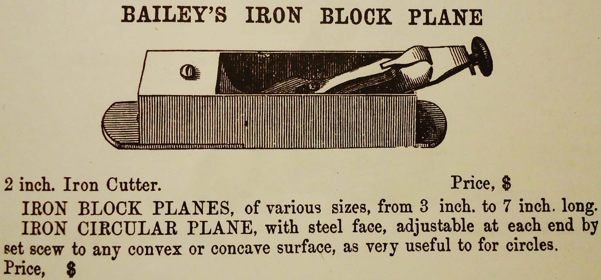 Bailey’s Patented iron planes, including his no. 9 Cabinetmakers’ Block plane, as offered in the Bliven & Mead Catalogue of 1864.