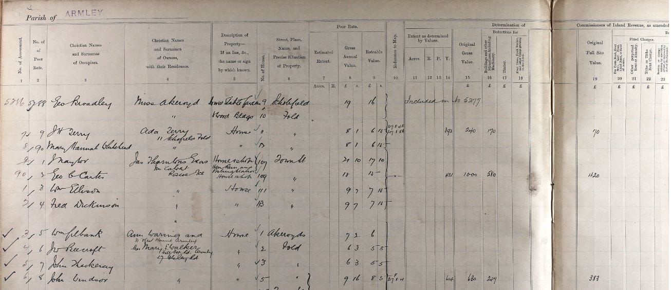J. W. Thackeray, 1910 Tax assessment. Thackeray rented his property. John William Thackeray married his second wife, Annie Elizabeth Stead (1866-1916) in North Bierley, Yorkshire, in the late Summer of 1909.