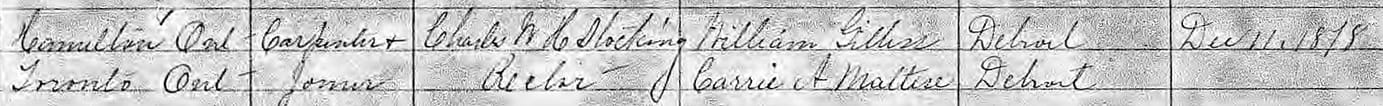 After William jr.’s apprenticeship, (presumably with his father), he moved to Detroit, Michigan, where he worked as a carpenter. In the 1870s, William George courted Susannah Julia Gettiss (1846-1937), originally from Toronto (and whose father was born in Paris, France). William and Susannah married on 9 October, 1878 in Detroit, Michigan. Shortly after marrying, the young couple moved to Chattanooga, Tenn, but they only remained there for 2 to 3 years, as William George and Susannah moved again to 204 Clinton St. in Cincinnati in 1881.