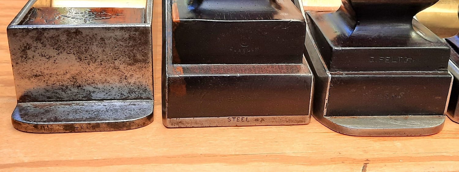 STEEL stamps on Mathieson (Norris) planes: left, STEEL with serifs c. ~1899-1905; middle, STEEL in plain letters c. ~1905-1910; right, STEEL in italicized letters c. ~1910-1940.