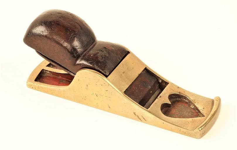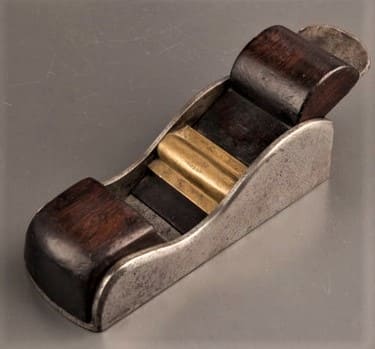 Unmarked quality Irish/Scottish chariot plane, with cupid’s bow on wedge. The iron is set at 17 degrees and is 1 3/4″ wide at the mouth. Rosewood was used to bed the cutter. Its an example of the creativity many craftworkers possessed in the late 19th century. Traces of Scottish mitres, English chariots, and block planes are all apparent in its design. Another example of this plane in iron was sold in the December 2016 D. Stanley Auction, lot 742.