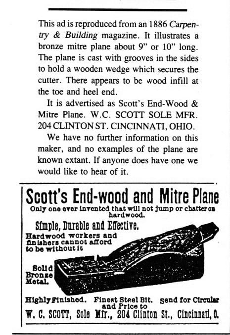 As recently as 1988, no known Scott mitre planes had been found and recognized. By 1992, Roger Smith included this plane in “Patented Transitions and Metallic Planes in America .