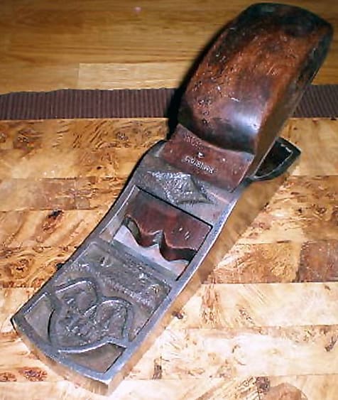 Edward Preston’s Irish Chariot plane, in his 1901 catalogue. The first version of the early type had 90 degree notches at the sides of the nose, as shown in the Preston 1901 catalogue. Subsequent copies of the later Irish Chariot plane did not have the faux screw countersinks in the toe.
