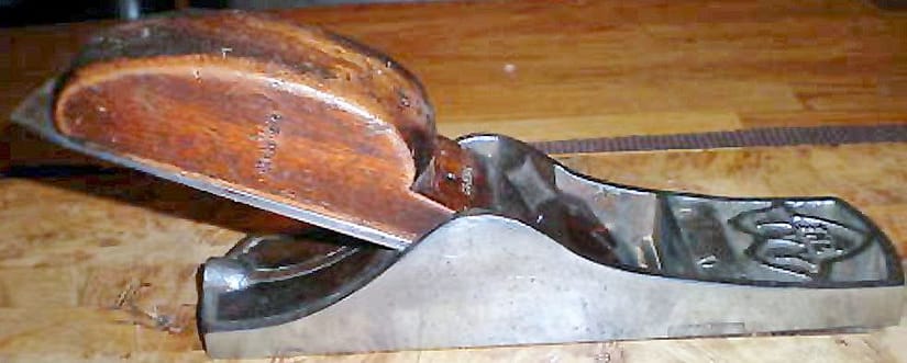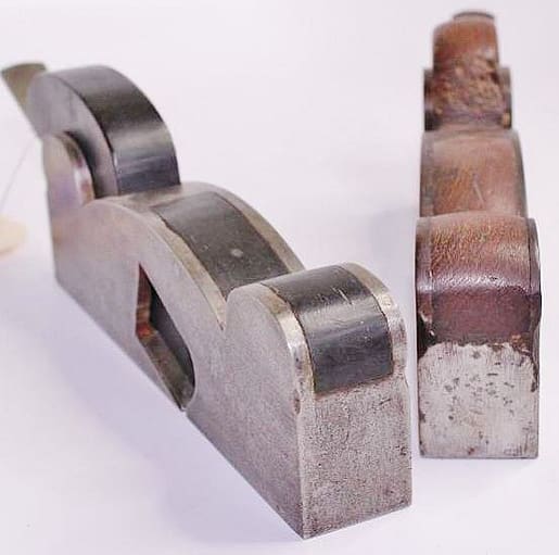 Lie Nielsen No. 9 plane, with the original in the background Lie Nielsen’s No. 9 plane is longer, with a sole 10 7/8″ long, as compared with the 9″ long c. 1900 Stanley shown here. It’s also more massive, and looks to be more robust as compared with the original body casting, which can be prone to cracking at the rear, where the handle is attached. When the top fixing screw for the Stanley No. 9’s adjustable front sole piece is driven too tight, the casting can also crack on the sides, right above the adjustable front sole. While this example does not suffer from these problems, the Lie Neilsen is the one I go to first: it cuts wood very well, with no worries about breakage. It is, however, a rather big rig–14″ if you include the handle attachment–the user made handle is slightly oversized, in order to push the plane more easily.