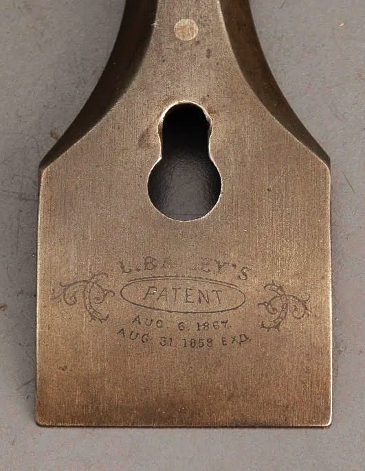 Next significant innovations included the introduction of a thinner cutting iron (patented 24 December, 1867), and a new depth adjustment for the cutting iron (patented 6 August, 1867). The thinner iron, the 1867 yoke adjustment knob/screw, and a new bracket for the rear handle comprised the main improvements for version 3 of the Bailey mitre plane. This new iron bracket, was attached with screws from the inside of the heel of the plane into the thick cast iron bracket, which now had a rosewood ball handle instead of the broomstick. The top of this casting was machined, to mate with the plane iron. The depth adjustment lever was mounted on a pilaster which was an integral part of the inner casting of the heel of the plane body. With the increased accuracy and control over production tolerances, Bailey no longer needed assembly numbers for the various components during the period of production starting in 1867. Version 4 (1869-c.1875>)