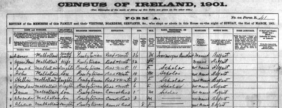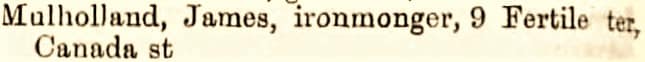 James Mulholland, “Ironmonger.” Home located at 37 Cypress Gardens, Belfast. Mulholland’s shop was a family business: son John Mulholland, 20, was an assistant ironmonger, Sarah, 21, was the book keeper, and James Jr., 15, was an ironmonger’s apprentice.
