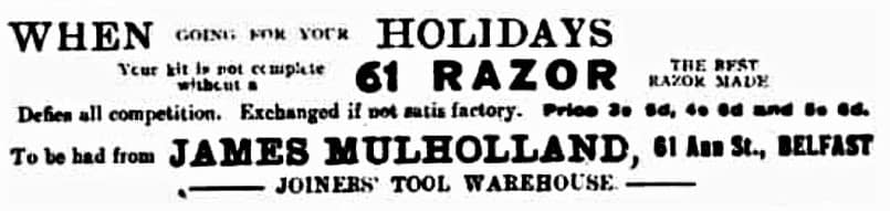 Was Mulholland first to make Irish chariot planes? –Only if a Mulholland plane is found without the 61 Ann St. address stamped on it. 1907 was the first year for Mullholland at 61 Ann Street, Belfast. In their 1901 catalogue, Preston included their Irish Chariot plane.