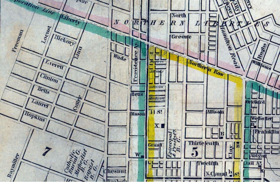 1845 Cincinnati street map, showing a portion of the West End, including Clinton St. Liberty and Linn Streets are still there.
