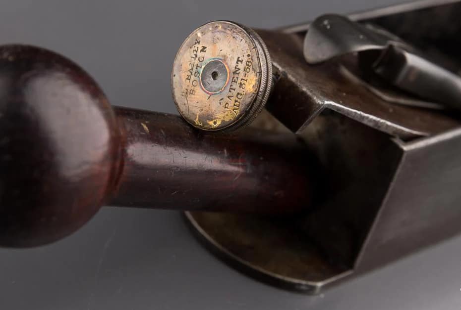 Bailey’s 1858 and 1867 Patents etched on lever cap of a No 9, version 4, with horizontal adjustment knob (1870s). Photo from