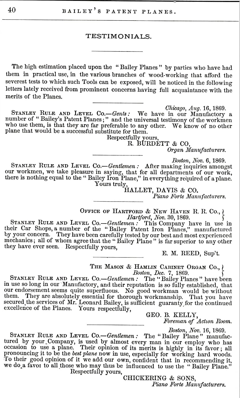 Bailey Plane testimonials as published in the Stanley Rule & Level Co.’s Catalogue of 1871. Mostly Piano and Organ Makers.