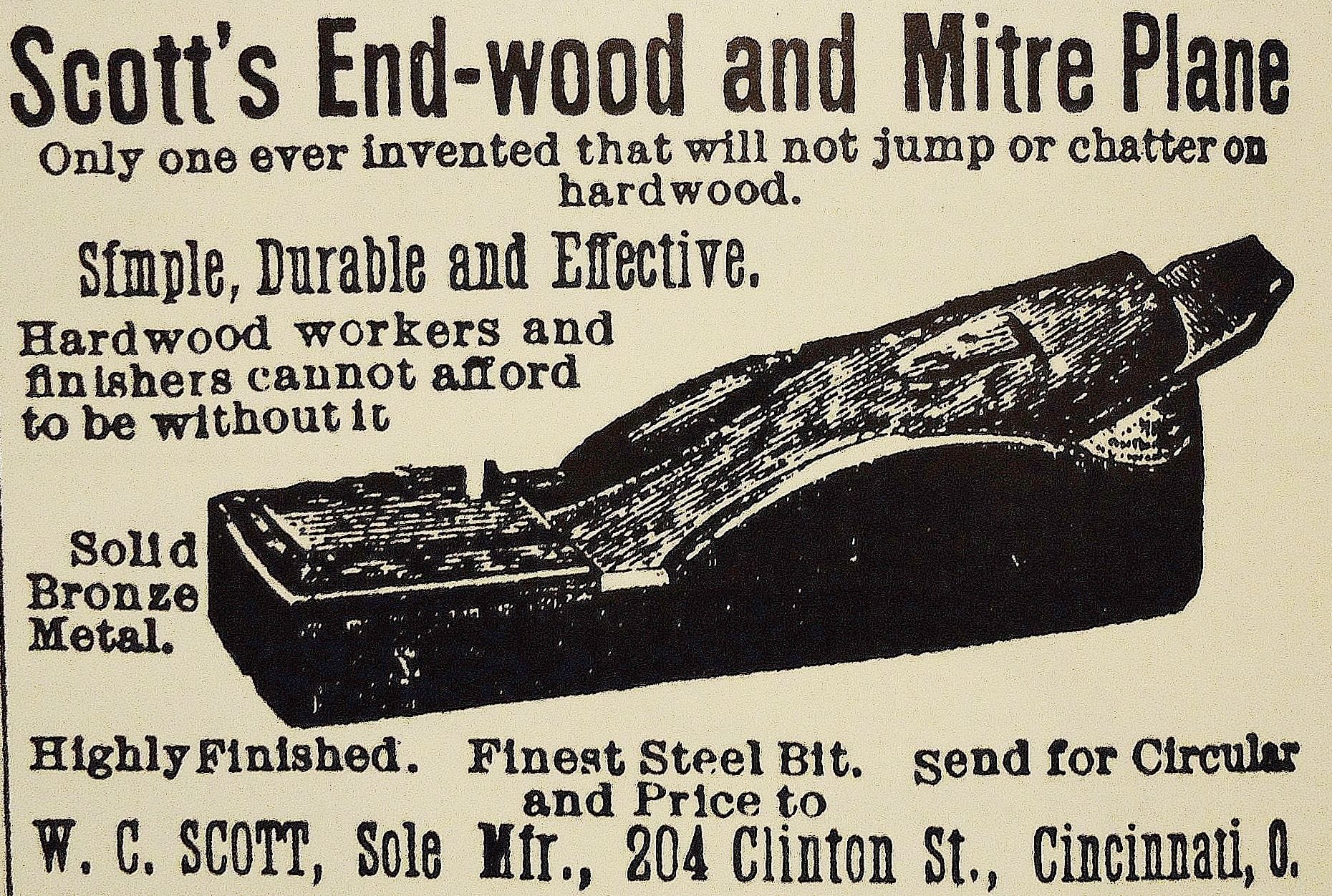“Sole Manufacturer,” could be taken literally: Scott likely worked alone, after business hours, in his home-based workshop. Its true that Scott mitres are rare, but the small and steady amount of them that surface over the years, indicate that Scott must have continued with his planemaking endeavors through a long timespan. This would also be supported by his use of many casting variations which would have been used for a good number of casting batches over time. Some Scott Family History
