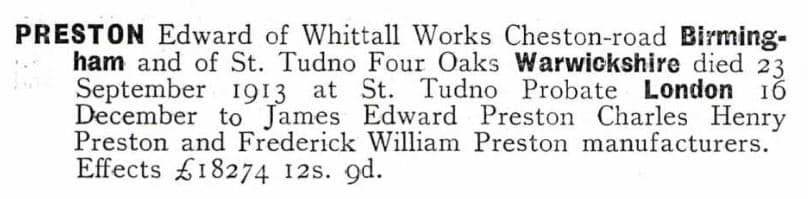 Preston factory, rendition in Preston 1901 catalogue. Invariably, all captains of industry asked their hired artists to make the most impressive image possible of their manufactories. Edward Preston Jr. (1835-1913) was no exception. At the factory’s peak before WWI, Preston employed about 200 men and women.
