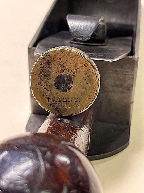 Early iteration (version 2) of the Bailey no. 9 Cabinet Makers Block Plane (or Pianomakers’ Mitre Plane). This one has the Aug 31, 1858 patent date, which covered his new lever cap with a cam lock, operated by a thumb lever. It’s not hard to see why Bailey changed the “broomstick” handle. Shown below are 8 photographs, taken by Jim Bode in June 2019, of a Bailey no. 9 mitre plane, version 2 (c.1858-1866), with a modified Moulson Bros., Sheffield iron.