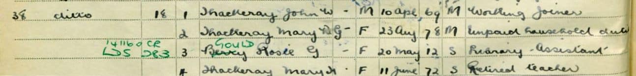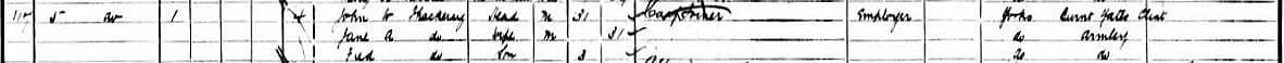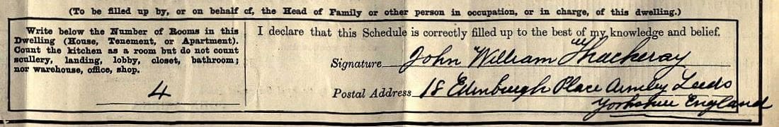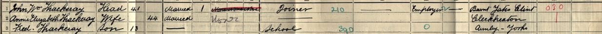 J. W. Thackeray in the 1901 U.K. census, 5 Elizabeth St. Armsley, Leeds. John W. Thackeray, was listed as a “Carpenter; Employer,” with wife Jane A. and son Fred, 3.