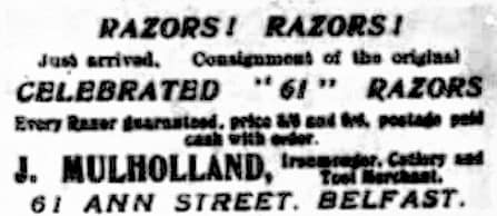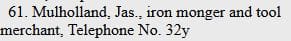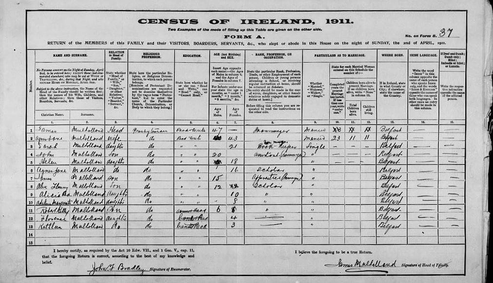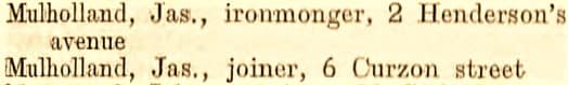 James Mulholland, “Ironmonger.” Home located at 37 Cypress Gardens, Belfast. Mulholland’s shop was a family business: son John Mulholland, 20, was an assistant ironmonger, Sarah, 21, was the book keeper, and James Jr., 15, was an ironmonger’s apprentice.