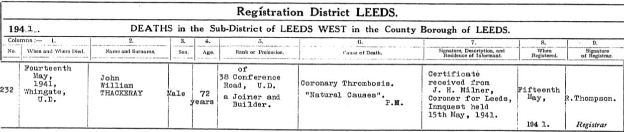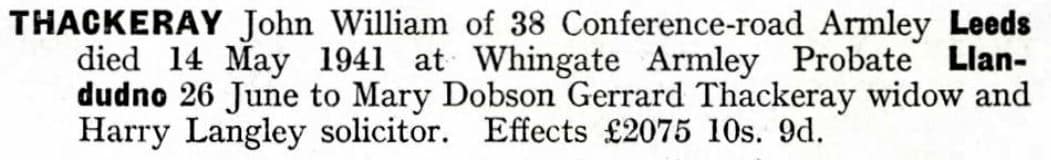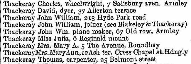 Thackeray entries for Leeds in the 1908 Kelly’s P.O. Directory. By 1908, John William’s father, Charles was working as a wheelwright. No doubt, most, if not all these Thackerays were related.