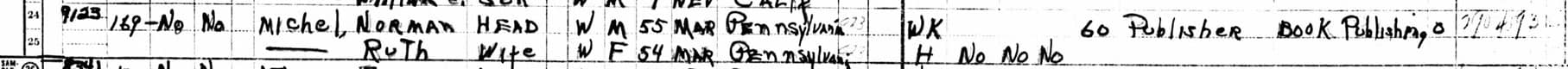 In 1950, Norman Michel had quit his job as a piano saleman, and was self-employed, and working 60 hours a week, compiling his Piano Atlas. 1950 U.S. Census.