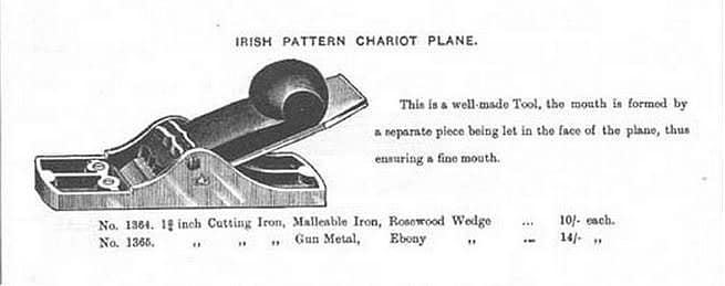 Edward Preston’s Irish Chariot plane, in his 1901 catalogue. The first version of the early type had 90 degree notches at the sides of the nose, as shown in the Preston 1901 catalogue. Subsequent copies of the later Irish Chariot plane did not have the faux screw countersinks in the toe.