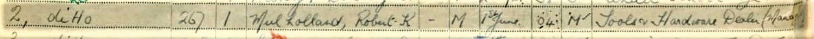 Robert Kelly Mulholland, 1939 War Register. Robert Kelly Mullholland was managing a tool and hardware store in Kent, England in 1939.