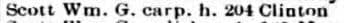 William Scott, carpenter. Cincinnati City Directory, 1882. First year of entry for Wm. Scott in Cincinnati. Clinton Street was in the West End, near the new Taft Information Technology High School on Ezzard Charles Drive. During the 1950s, the historic West End was razed for ‘urban renewal.’