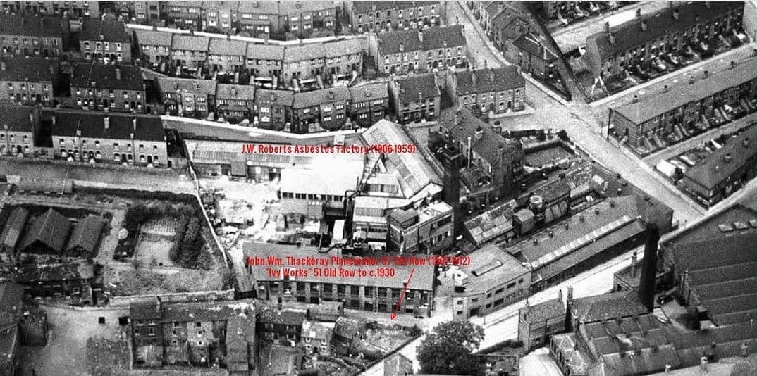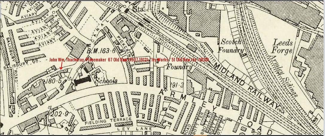 Detail of Old Row, Armsley, Leeds, from 1907 Ordnance Survey map. This map was drawn before J.W. Roberts Asbestos factory was built. Two foundries and a forge were minutes away from Old Row. Price competition between these foundries likely made it viable for Thackeray to sell unfinished plane castings profitably. Like other planemakers, Thackeray would have owned his proprietary moulds and cores, bringing them to the foundry when a new batch was required.