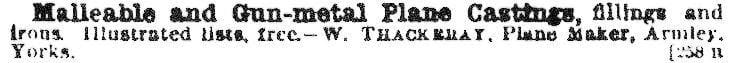 John William Thackeray’s ad in the “Illustrated Journal for Mechanics,” volume 14, circa 1898. From the beginning of his planemaking career, John William Thackeray offered an a la carte menu for his customers.