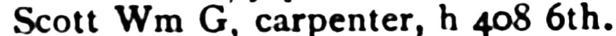 William G. Scott Jr., Carpenter 408 6th, Detroit, Michigan, as recorded in the Detroit City Directory for 1874.