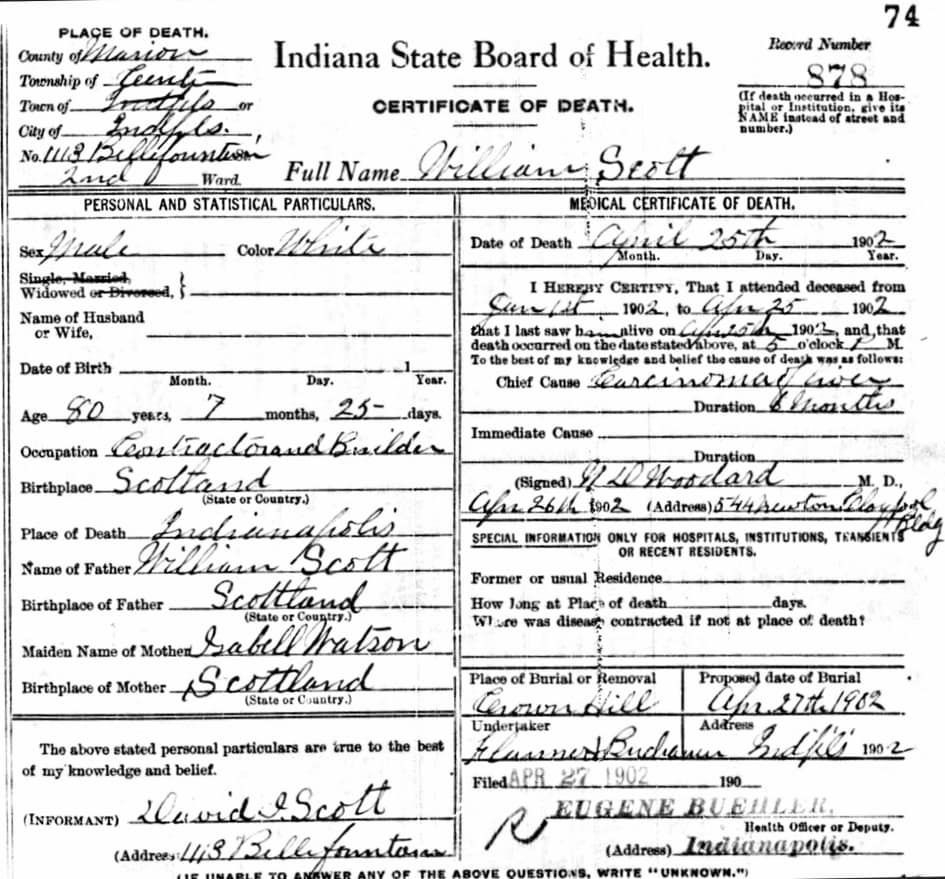 Indianapolis Journal 26 Apr 1902 p. 3 “William Scott, after an illness of several weeks, died at 5 o’clock yesterday afternoon at his residence, 1113 Bellefontaine Street. Mr. Scott was 80 years of age. He was a native of Scotland. Coming to America with his wife, whom he survived by 6 years, he first located in Canada, but removed to Lafayette, IN and soon afterward came to this city where he had resided for the last 40 years. He was one of the oldest builders and contractors and continued in business until a few months ago. His sturdy character and thoroughness were evidence in all his work, even in the rush and boom years of the early [18]70’s when he was very actively engaged. Mr. Scott was a member of the First Presbyterian Church and was a thorough-going Scotch Presbyterian. He leaves a family of 7 children. They are David I. and Walter P. contractors; John with George J. Mayer and Co.; Misses Elizabeth and Belle W. and Hattie of this city and Mrs. Lee Williamson of Terre Haute. Mr. Scott was identified with many benevolences and in former years was associated with the late Father Bessonies and John G. Blake in acts of charity. He was one of the builders of the Sixth Presbyterian Church on the South Side. He was a member of the Masonic fraternity. He was a lifelong Republican and had much to do with the upbuilding of the party in this city and state in the earlier years of that political organization.”