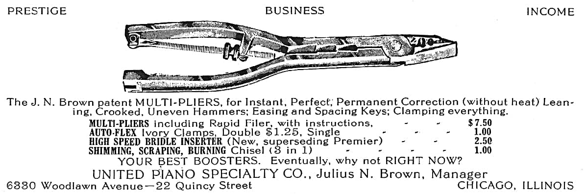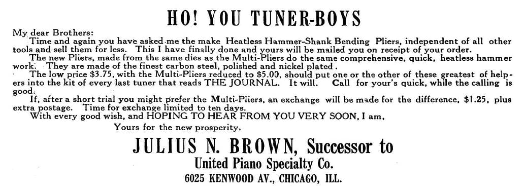 “HO TUNER BOYS,” Julius Brown, specialized pliers for bending maple piano hammershanks cold. Tuners Journal, December, 1924. Because $7.50 for a set of Multi-pliers was a lot of money in the early 1920s, a number of piano tuners asked Julius Brown to make pliers specialized for bending hammershanks cold, only–at a lower price. In 1924, Brown consented, and made a simplified version of his pliers for $3.75. I will leave it to you to assess how Julius felt about this, based on his salutation in this advertisement.