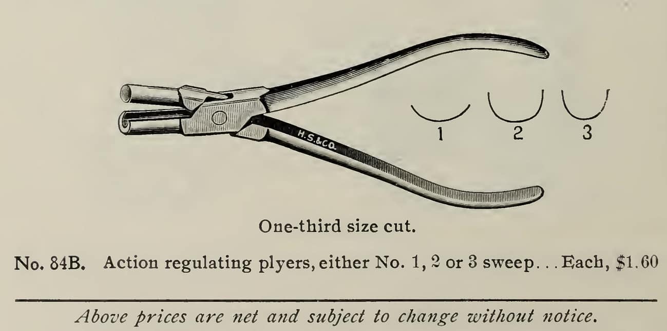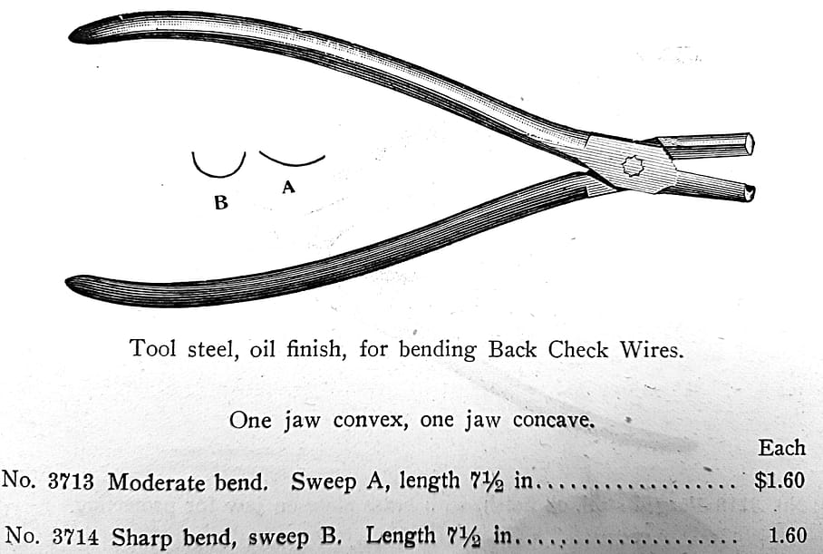 H.S. & Co. N.Y. Action Regulation Pliers, offered in 3 sweep patterns. From 1903 Catalogue. Apparently, the choice was important to piano workers at the time; to my knowledge, no current piano supply company offers several sweeps within one set of pliers. Stock number 84 B1 was the least sharp bend in the 1903 catalog.