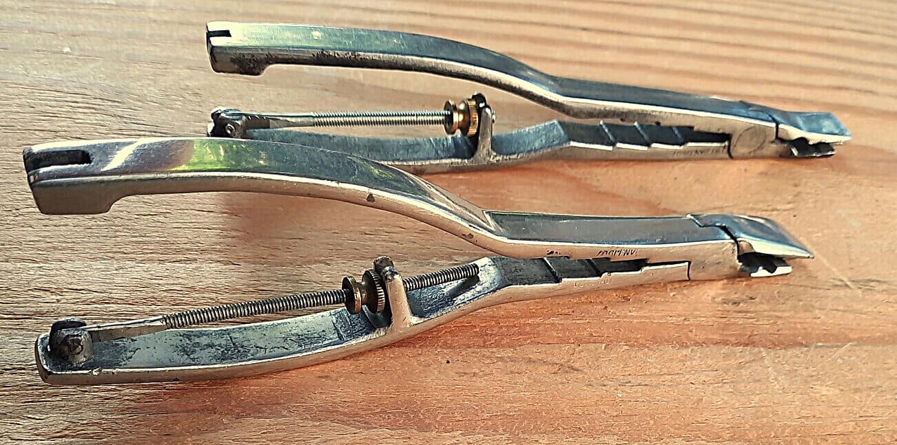 Some dental extraction pliers have similar handles to the pliers on the left (above), and directly on the left, so these pliers may have been based on a set of them. The round jaw has a groove or notch, and the jaws do not touch when the pliers are closed. The H.S. pliers were made for spreading the loops in bridal wires to allow for easier installation and removal of the the bridal tape tips.