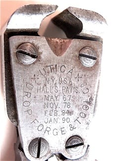 Hall’s patent compound action plier, in music wire variant. H. S. catalog, 1885. H. S. catalog, 1885. Before Utica took over production of the Hall’s pliers, they were made by the Interchangeable Tool Co. of New York, N.Y., which was connected to the Hall family. This was a reference to the interchangeability of the pliers’ parts, a concept not fully taken for granted in the 1860s. Extra jaws were available, as they would sometimes break under very heavy compression. Screws would also work loose, and many of these are found with one or more replaced screws. I’ve cobbled together a few of these broken pliers, dealing with flying parts resulting from the strong internal butterfly spring. Experience has shown me that they are not fully interchangeable: a small amount of hand finishing was done to every set of pliers.