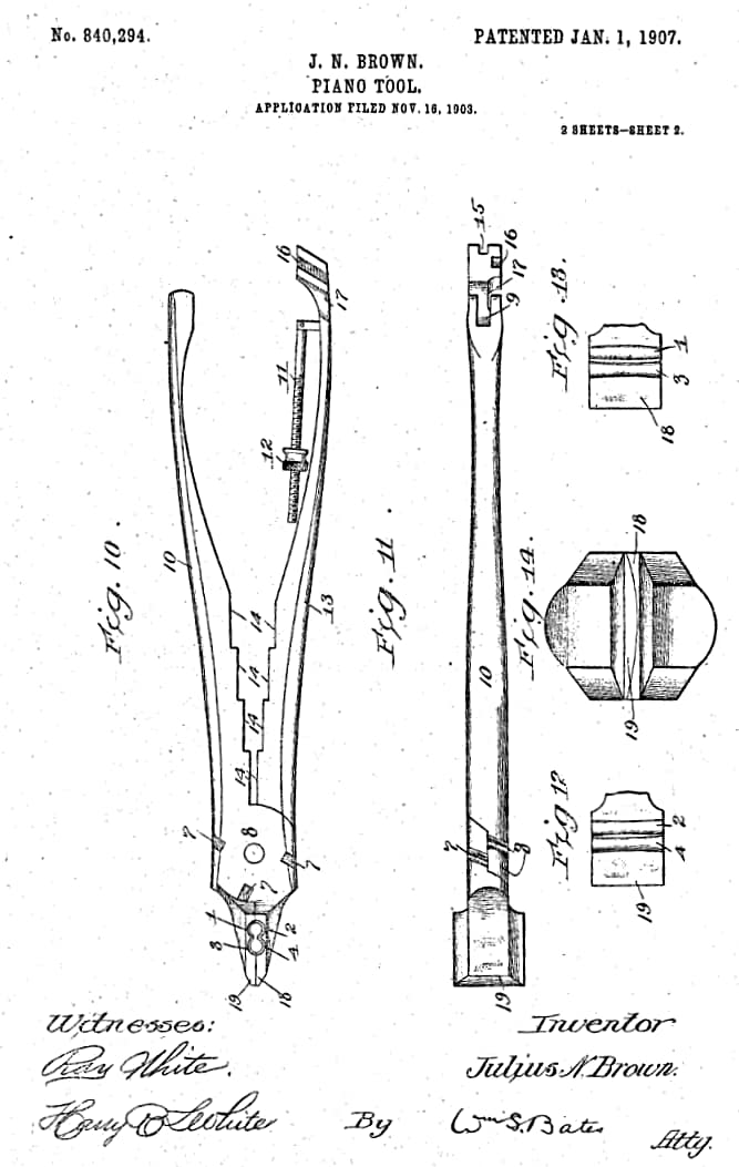 Julius N. Brown applied to patent his Multi-Pliers in 1903, and was granted a patent for them on 1 January, 1907. Brown’s Multi-Pliers were popular with piano technicians from c. 1910 to 1930, but they are not in use today.