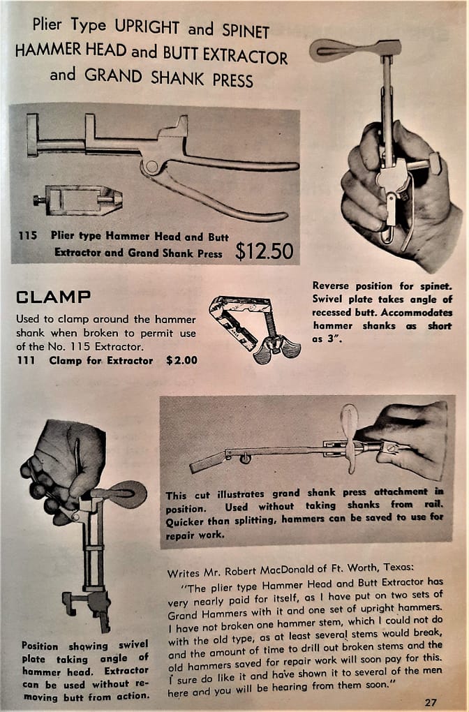 Letterhead pattern, from Hale 1953 Catalogue. The market for this sort of thing ended by aroundHale advertisement for their combination pliers in the Piano Technician’s Journal in 1986. Clearly, the writers of this ad were not very aware of their end readers, who would have been a mix of older technicians who entered the field shortly after WWII, and the first wave of baby boomers, born between 1946 and 1953. Many boomers entered the piano technology field between 1970 and 1975, and, as a group, were intent on raising the general standard of piano work within the profession. By 1986, many of these folks had become established, and were gaining entry into the closely held institutions, venues, and private work indicative of a burgeoning dominance within the piano technology field. Pulling off a “piano caper” would not have appealed, generally, to this emerging group of boomers, but was more in line with the orientation of some of the older technicians, certainly not all of them howeverFrankly, I was surprised to learn that Hale plier-type hammer extracting tool shown below was developed as early as circa 1948-1950.