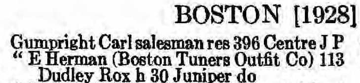Final year for Gumpright (1928) and Boston Tuners Outfit at 113 Dudley St., Roxbury, in the Boston City Directory.