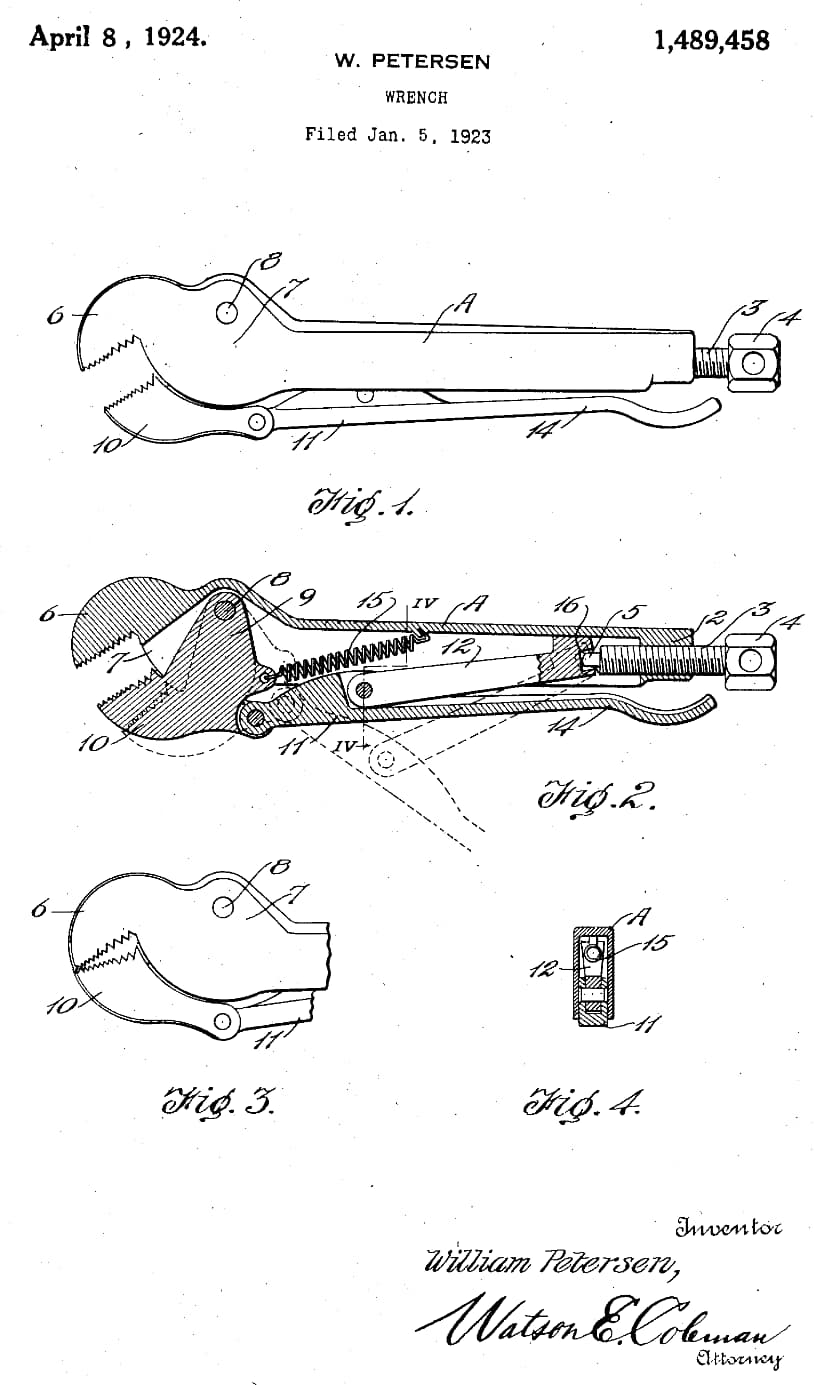 Vise-Grip locking pliers (second version), patented 8 April, 1924 by William Petersen.