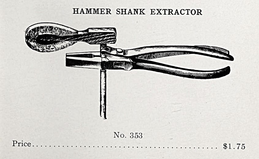Early type of Hammer Extracting Pliers, which fell into obsolescence by the 1920s. From Otto Higel, Toronto Piano Supply Catalogue, 1906.