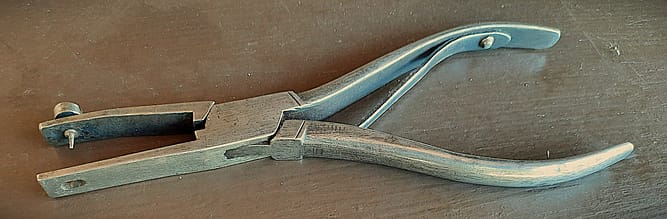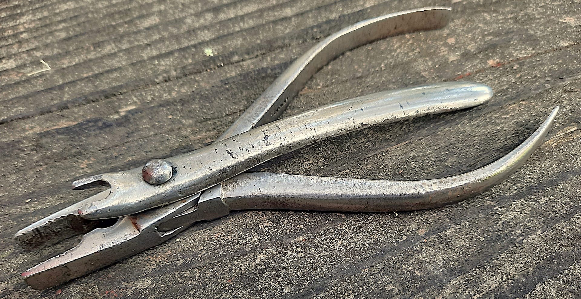 Some dental extraction pliers have similar handles to the pliers on the left (above), and directly on the left, so these pliers may have been based on a set of them. The round jaw has a groove or notch, and the jaws do not touch when the pliers are closed. The H.S. pliers were made for spreading the loops in bridal wires to allow for easier installation and removal of the the bridal tape tips.