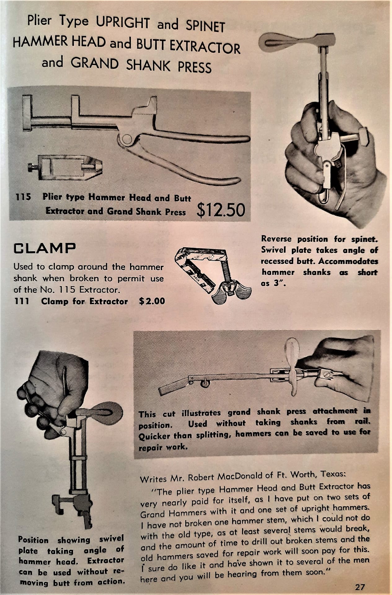 Hale Plier Hammer Extractor, as advertised in the January, 1951 issue of “The Piano Technician.” The upright and grand hammer extractor functions worked pretty well on this tool. The knuckle and center pin extraction functions never gained much traction. Not having tried the center pin function, but being familiar with the other functions, I’d think that the center pin function would not be sufficiently precise. This multi-pliers design, developed by Hale, is still available from Baumgaertel in Germany and from piano suppliers in China.
