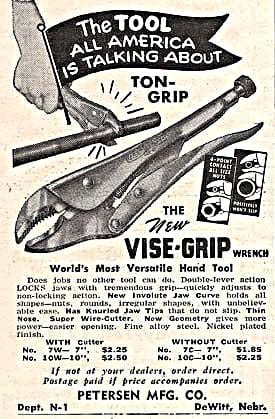 William Petersen was a blacksmith who had immigrated to DeWitt Nebraska from Denmark. After The Great War, Petersen was looking for a way to hold his blacksmithing work while heating without having to physically clench down on his blacksmithing tongs. He invented the first version of his vise-grips around 1920, and he continued to revise and subsequently patent repeated iterations of his vise-grip locking pliers, until arriving at the version we know today in 1957, with the easy release lever. From the beginning, William Petersen made locking pliers by himself, eventually adding a few employees. By 1934, Petersen established a company, Petersen Mfg. Co., to produce his Vise-Grip locking pliers, and four years later, the first Vise-Grip factory was established in a former drug store in Dewitt, Nebraska with 37 workers. Vise-Grip pliers were manufactured in the United States under various owners until 2008, when production was outsourced to China. Malco Eagle Grip pliers were also made in DeWitt, Nebraska, but production was stopped in 2022.