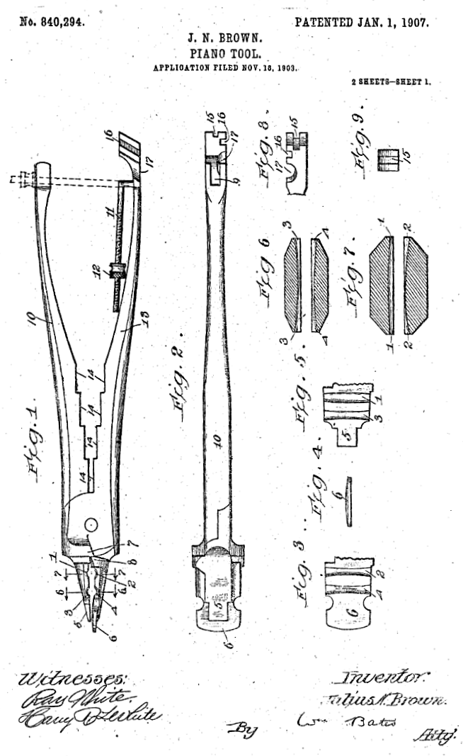 Julius N. Brown applied to patent his Multi-Pliers in 1903, and was granted a patent for them on 1 January, 1907. Brown’s Multi-Pliers were popular with piano technicians from c. 1910 to 1930, but they are not in use today.