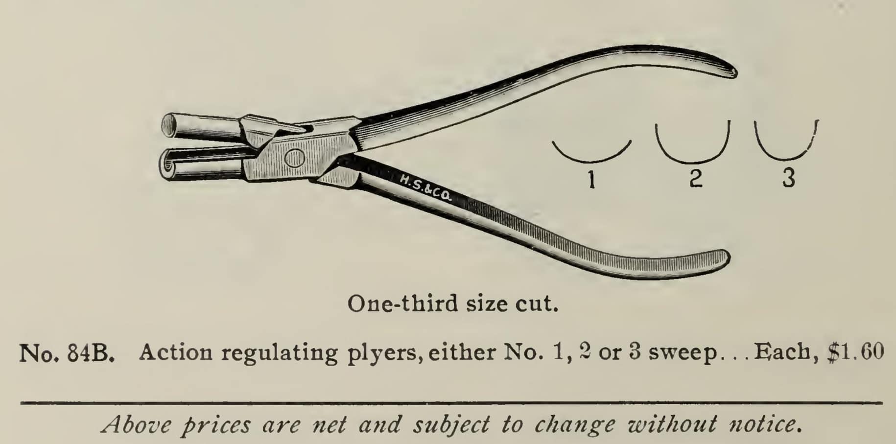 H.S. & Co. N.Y. Action Regulation Pliers, offered in 3 sweep patterns. From 1903 Catalogue. Apparently, the choice was important to piano workers at the time; to my knowledge, no current piano supply company offers several sweeps within one set of pliers. Stock number 84 B1 was the least sharp bend in the 1903 catalog.