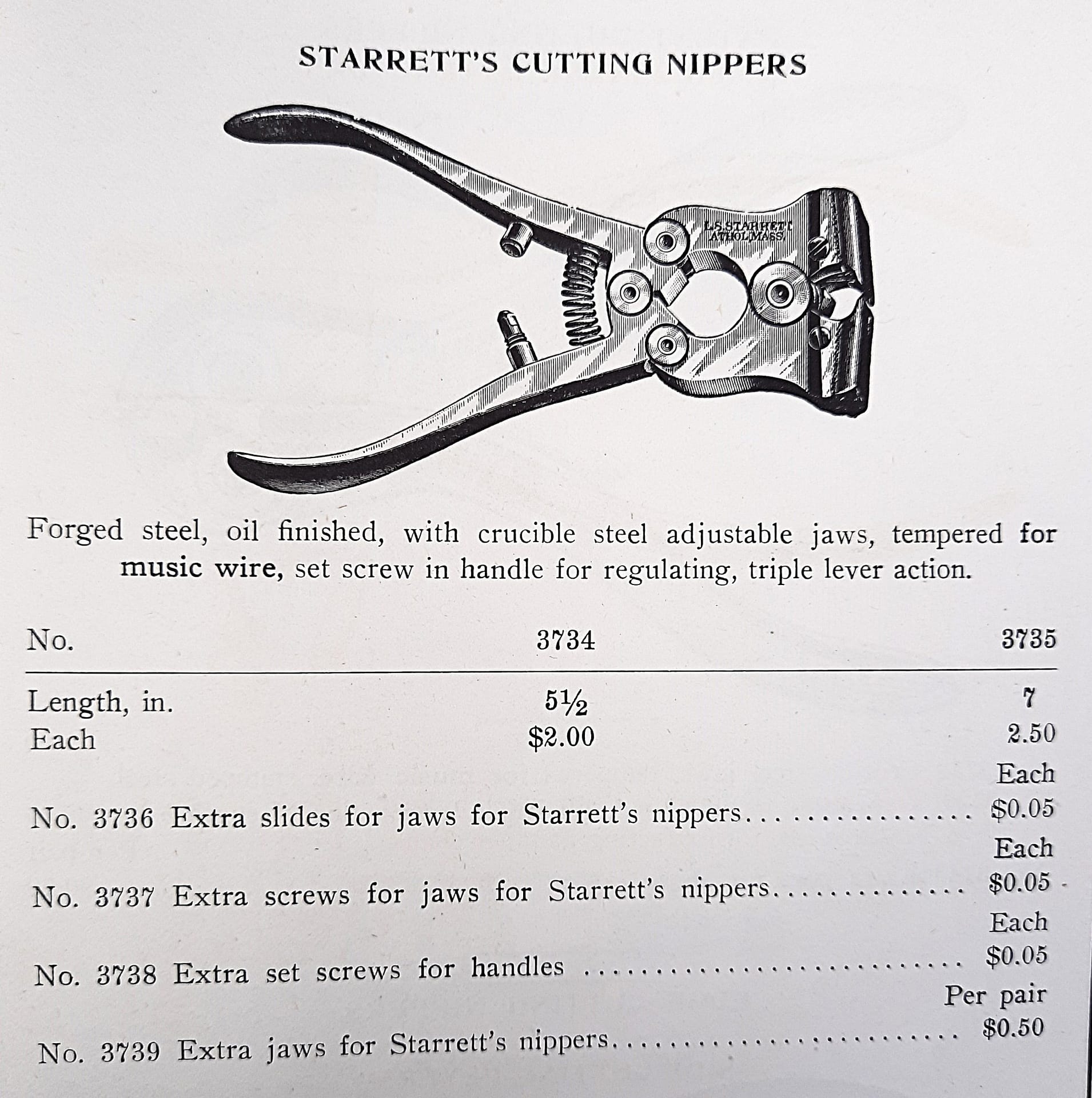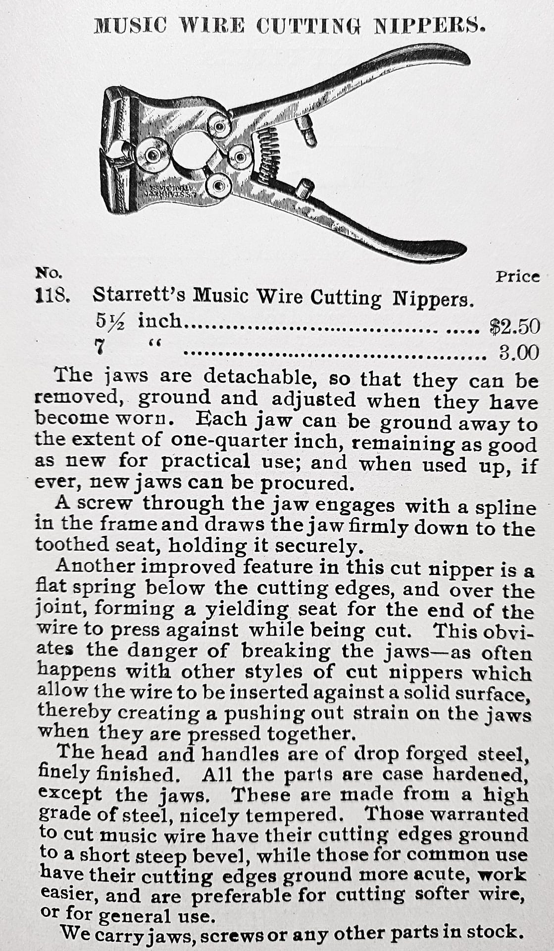 American Felt Co. 1911. Starrett music wire cutters, from Lang/ L&.H 1914 catalogue. These pliers are still available today from Starrett. Starrett also makes a music wire gauge, and a portable bottle jack, used to support the pinblock when stringing grand pianos.