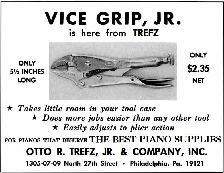 Vice-Grips, in new small size, as advertised by Trefz Piano Supply, in “The Piano Technicians Journal,” October, 1968. Vice (sic) perhaps a Freudian slip?