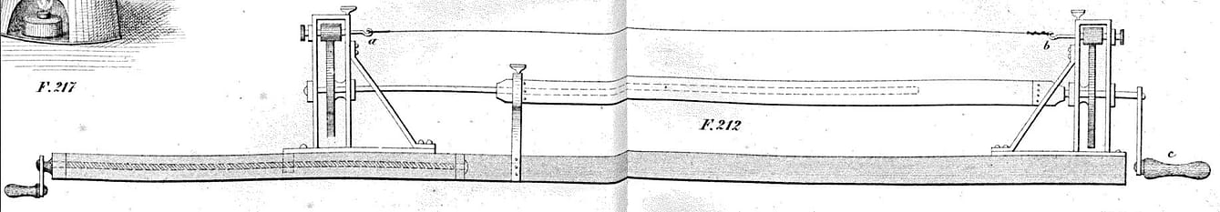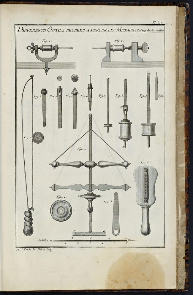Diderot Vol. 5, plate 10. one and double-ended lathes used by makers of wind instruments, flutes, oboes, clarinets, etc.