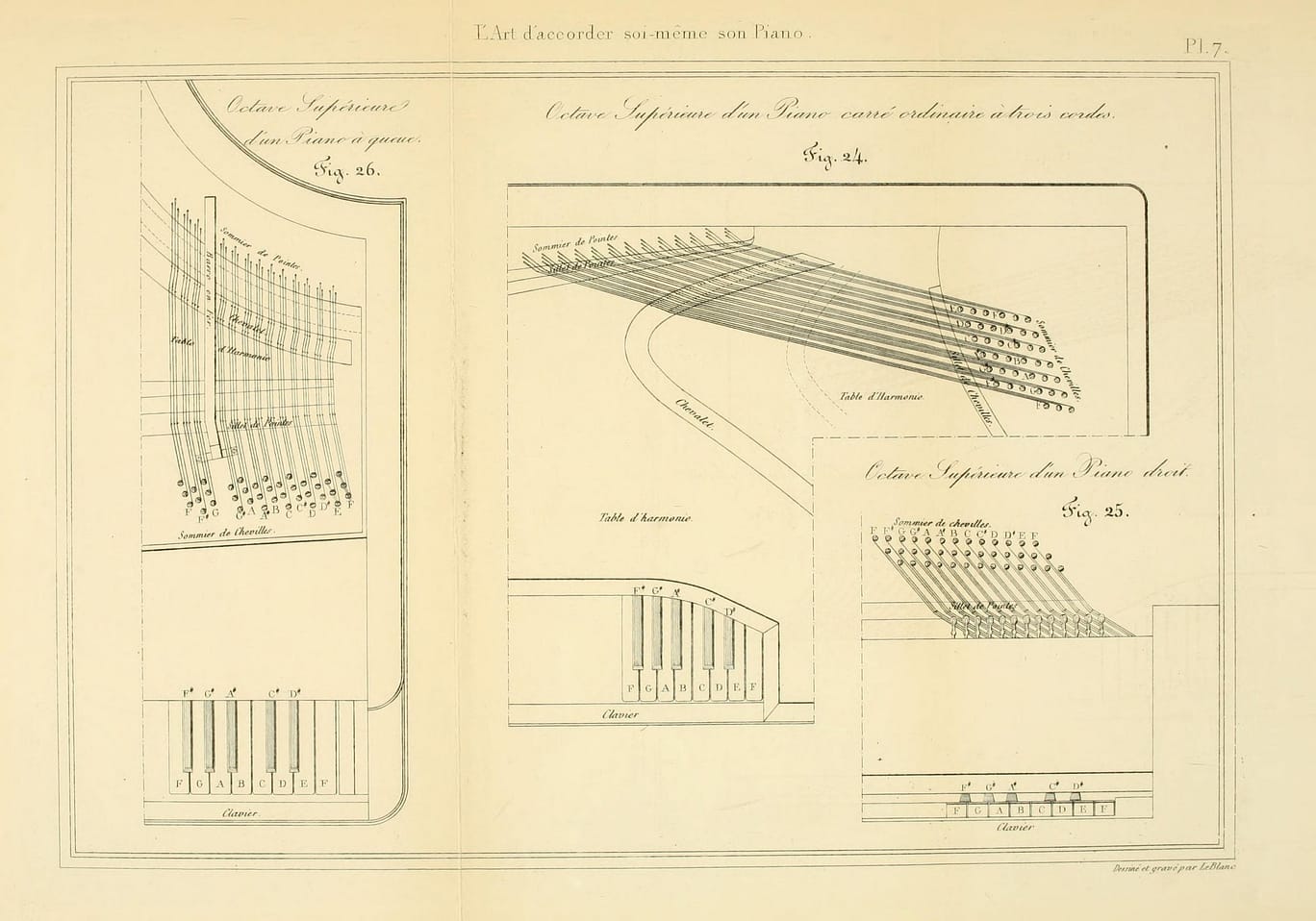 Claude Montal’s Plate of piano tools. From left to right: Metal tuning hammer oblong socket; Square socket; Wood-handled tuning hammer, removable tubes—for oblong and square pins; Interspersed, three types of mutes, for silencing certain strings during tuning; Flat-nosed pliers; Music-wire gauge; Piano-wire cutters; Hand vise Tuning lever, gooseneck, with stringing hook; Components for two universal style tuning hammers; Two tuning forks (diapason) and case (#34 used to draw between the tines to sound the pitch), and looping/braiding machine. Illustrations in the bottom right show loops and braids being made for the single strings, and then in the lower one the string being wound on the pin, which does not have a string becket and hole (as in modern tuning pins).