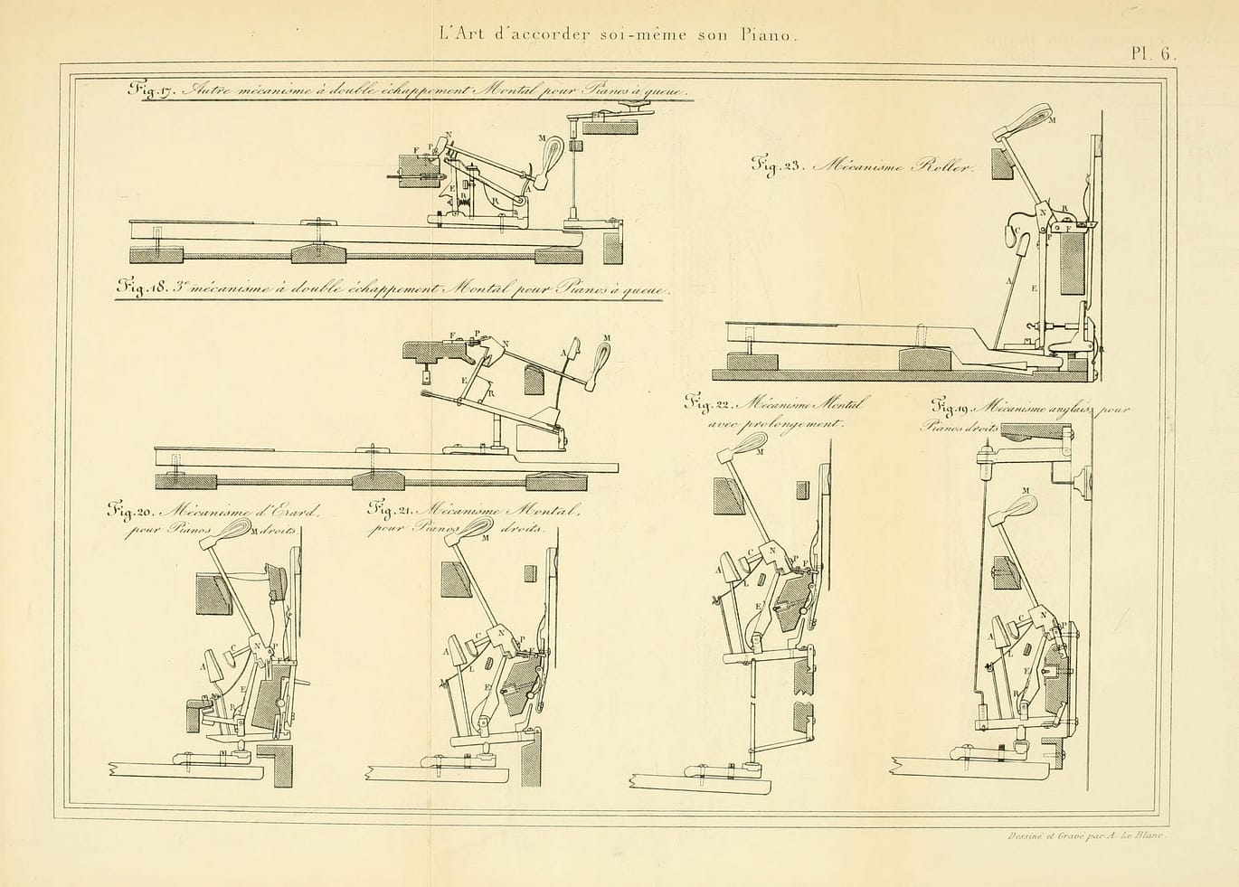 The following plates from Montal’s “l’Art d’accorder…” show pianos, details of pianos, and piano actions, but only show a few tools within plates 9 and 10. Montal’s plates are included here, because they can be challenging to view as complete images with decent resolution.