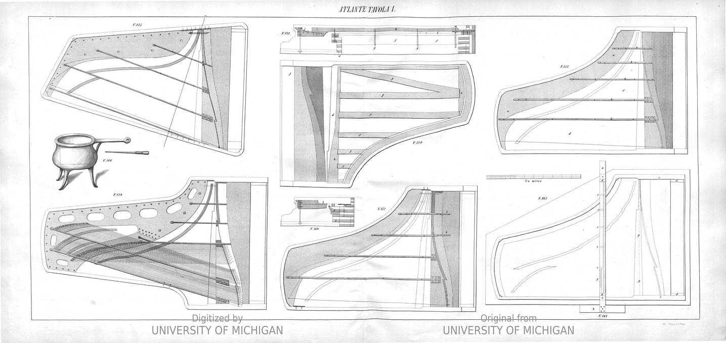 Figure 166 Bain-marie pot for glue; Fig. 167, 168 Soundboard, bridges and rim schematic of grand piano; 169, 170, 171 Top and side structural view of French type grand piano; 172, 173, view of structural bars and plates; 174 Overstrung grand piano; 175 cone-shaped grand piano Compartment square drawing French grand speakers Metal bars and cords Two-string piano with crossed strings id. cone-shaped